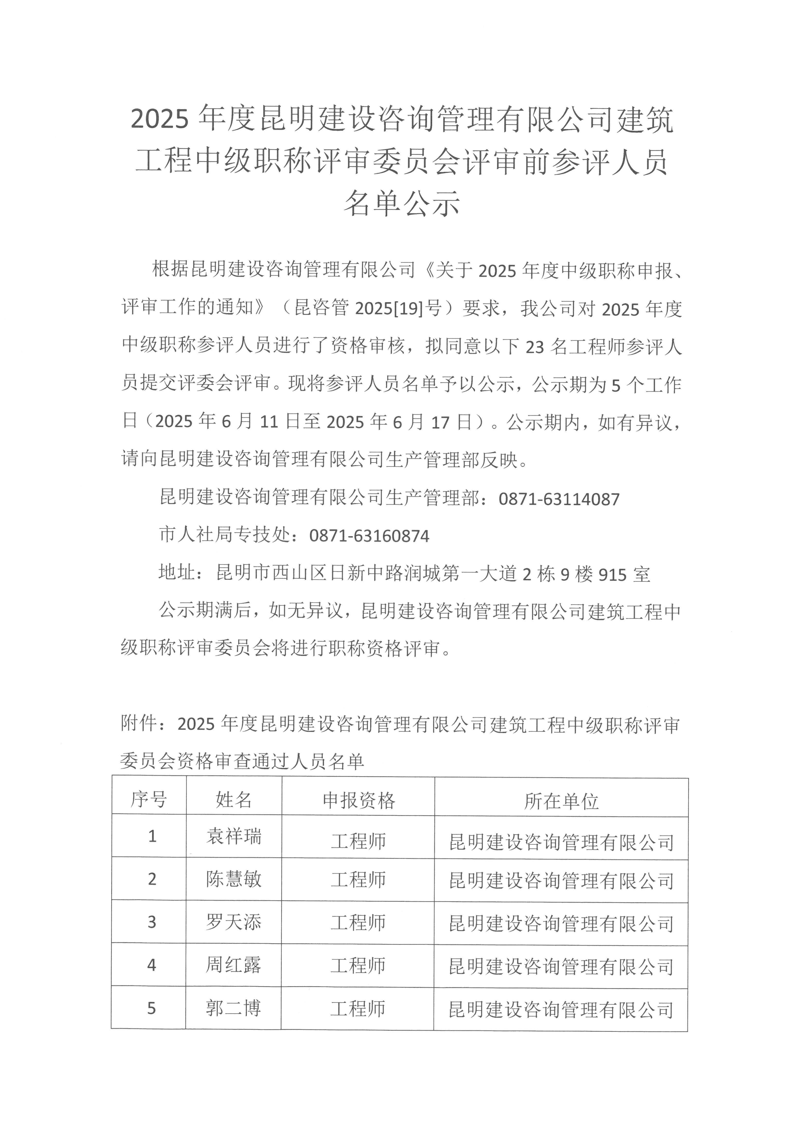 2025年度昆明建設(shè)咨詢管理有限公司建筑工程中級職稱評審委員會評審前參評人員名單公示