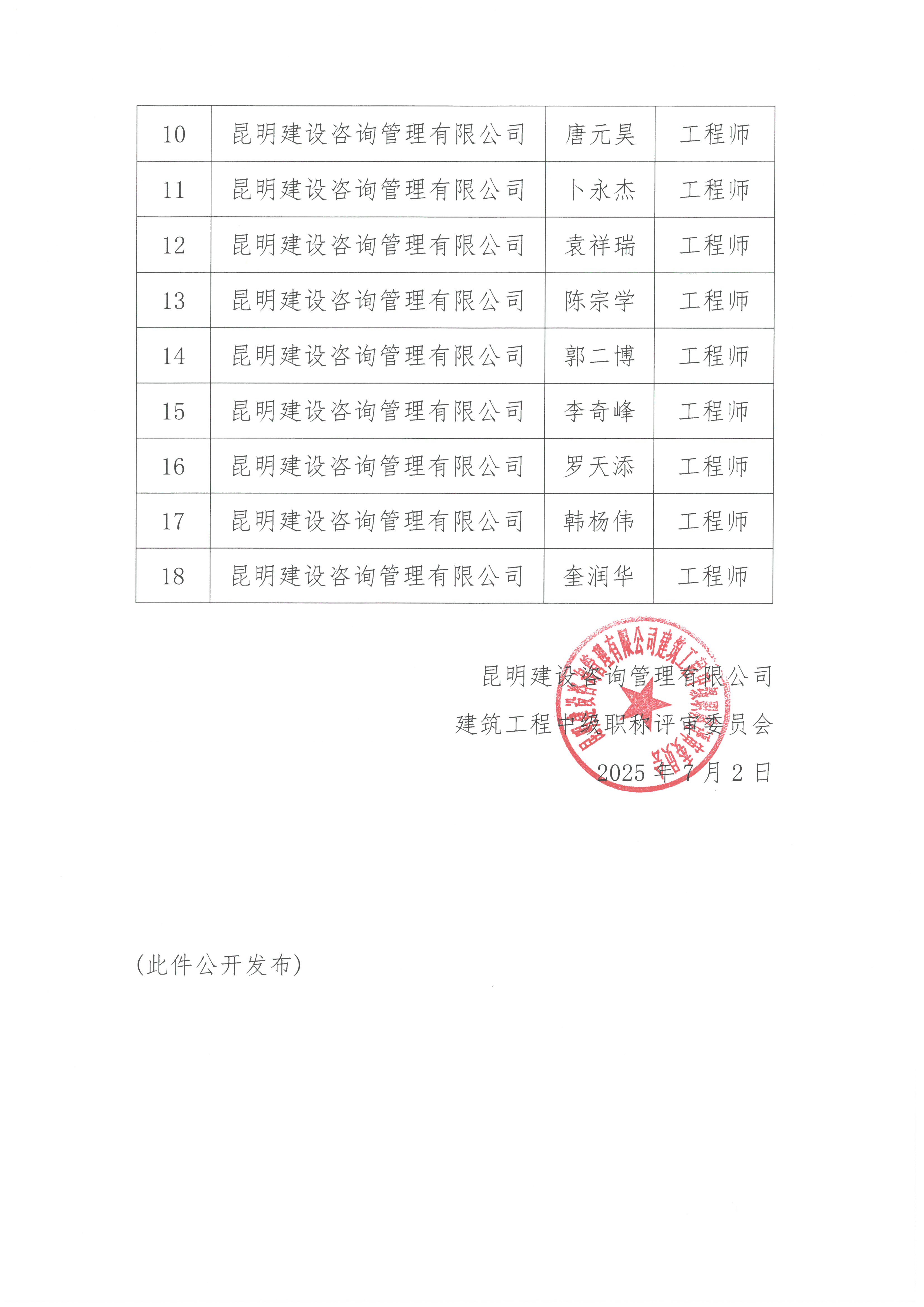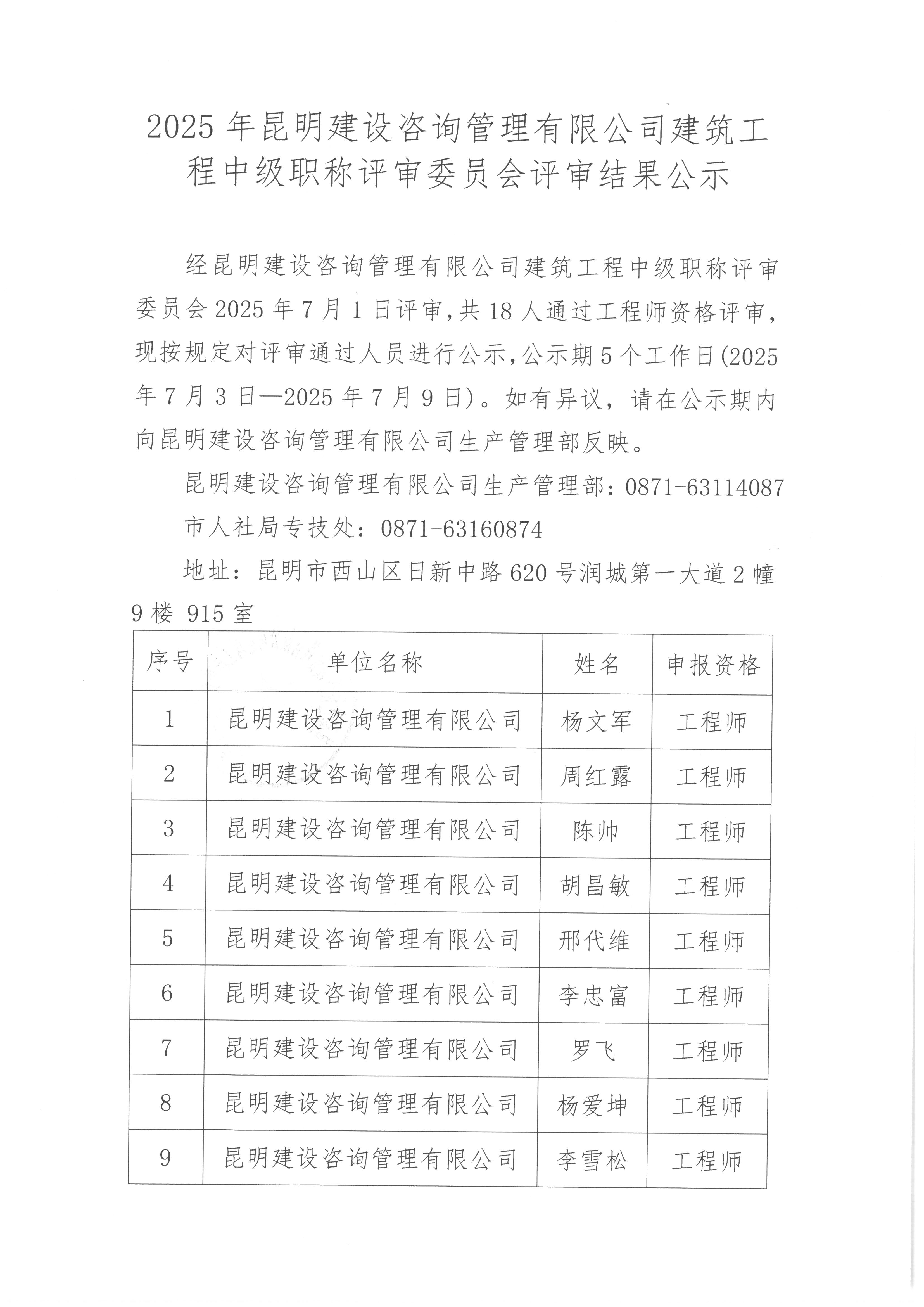 2025年昆明建設(shè)咨詢管理有限公司建筑工程中級職稱評審委員會評審結(jié)果公示